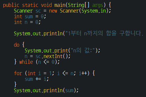 실습 1-6/ 양수만 입력하여 1부터 n까지의 합 구하기
