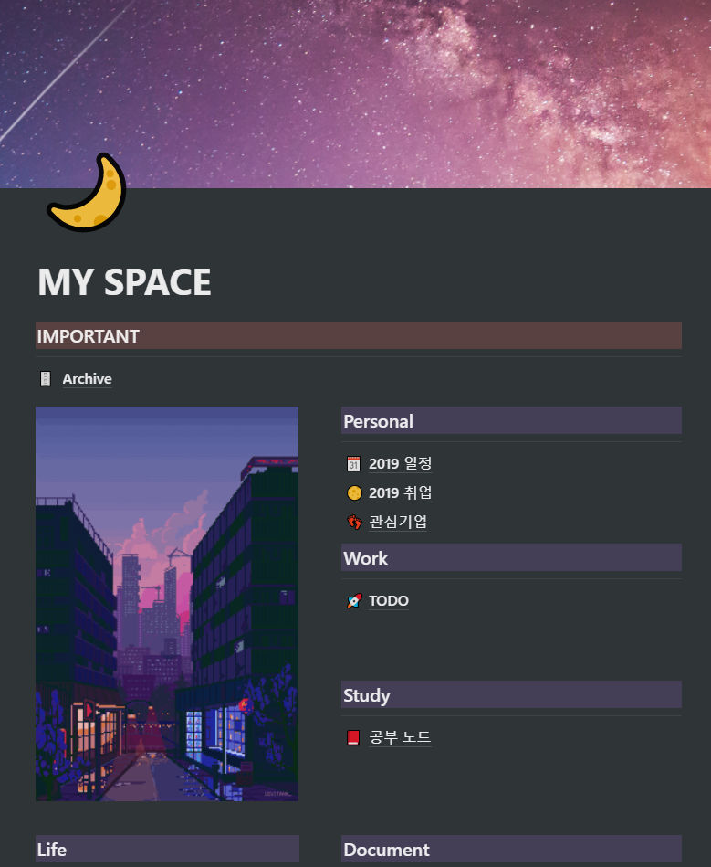 위 사진은 내가 정리 해 놓은 대시보드이다. 노션을 효율적으로 사용하기 위해 가장 첫 페이지에 본인이 자주 사용하는 블럭들을 모아놓고 사용하는 사람들이 많이 있었다. 실제로 사용해 본 결과 굉장히 편리하고, 본인이 원하는 이미지와 커버, 기능들을 추가할 수 있기에 꾸미기 좋아하는 사람들에게 정말 최고가 아닐까 싶었다. (무엇보다 엄청 예쁘다)
