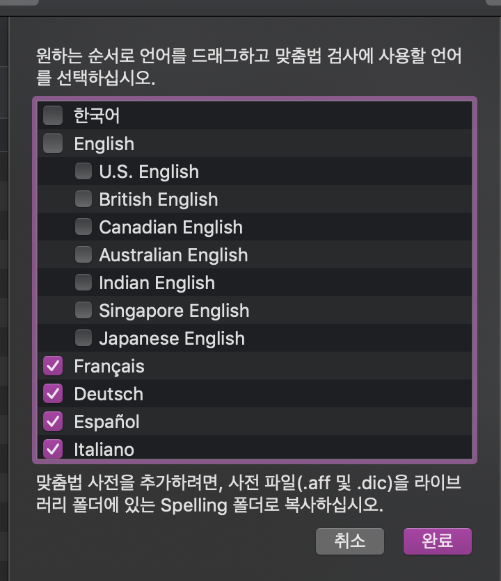 본인이 맞춤법 검사를 하고싶지않은 언어를 선택해제 해주면 맥북의 모든 어플에서 빨간 밑줄이 사라진다.